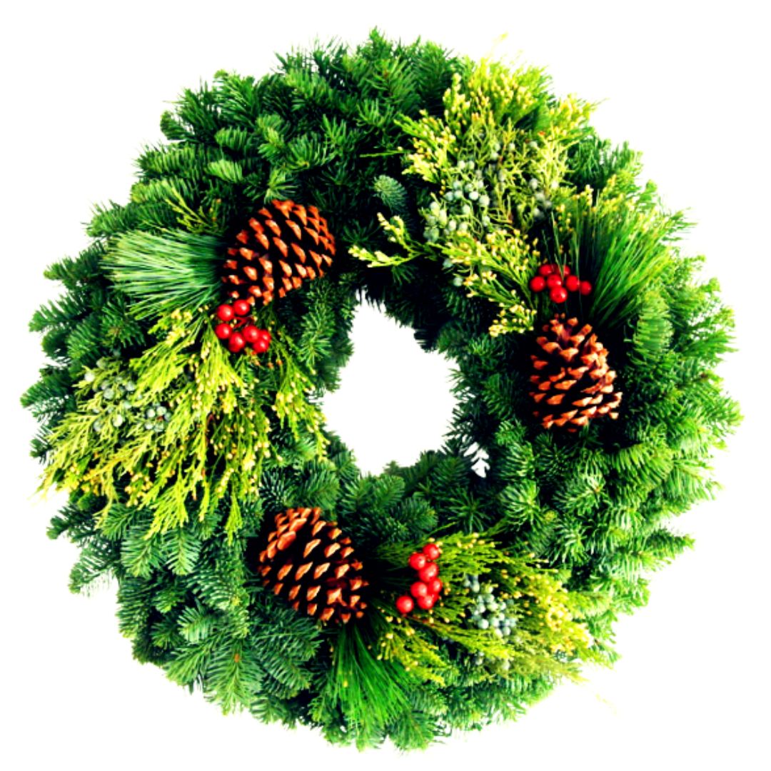 Noble wreath with juniper berries, incense cedar, princess pine, artificial berries, and cones.